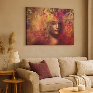 Lærredstryk - Billede på lærred - En kvinde i abstrakte farver skaber en dynamisk baggrund - 70x50cm - Her er jeg! - Moderne vægdekoration til stue og soveværelse ARTTOR