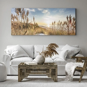 - Dette lærredstryk på 70x50 cm forestiller en malerisk strand med græs, sand og en nedgående sol. Det er den perfekte dekoration for naturelskere og rolige landskaber.
