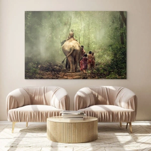 - Dette charmerende maleri forestiller en elefant i skoven, anført af børn klædt i traditionelle kostumer. Et motiv fyldt med fred og harmoni, perfekt til interiør inspireret af naturen eller østlig kultur.
