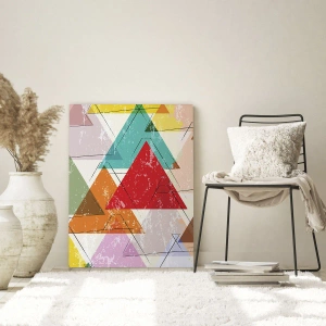- Dette maleri har et farverigt, abstrakt mønster af trekanter i forskellige nuancer, perfekt til moderne interiører. Det er et perfekt valg til en stue eller et kontor.