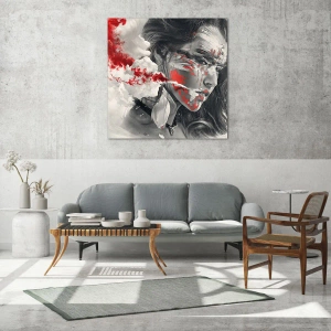 Glaskunsttrykket "I absurditetens tåger" er et ekstraordinært værk, der tiltrækker opmærksomhed med sin slående kontrast og moderne karakter. Portræt af en kvinde, hvis ansigt er prydet med abstrakte røde og hvide mønstre, introducerer en aura af mystik og udtryk til interiøret. Delikate detaljer kombineret med intense farver skaber en dynamisk og mindeværdig komposition.