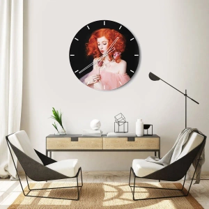 - Dette runde vægur, der måler 30x30 cm i diameter, forestiller et portræt af en kvinde med skinnende røde krøller, der holder en rose. Dets elegante design i pastelfarver giver en subtil og romantisk atmosfære til interiøret.