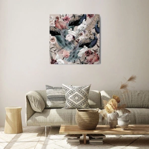 Vægur, Uret - Påfugl og hvide fugle blandt blomster på en beige baggrund - 30x30cm - I paladsets have - Moderne vægdekoration til stue, køkken og soveværelse ARTTOR