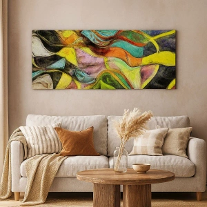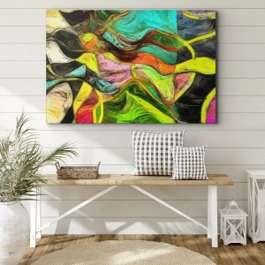 Lærredsbilledet "Bevægelse er liv" er et unikt kunstværk, der tiltrækker opmærksomhed med sin abstrakte form og intense farver. Kompositionen består af forskellige farverige pletter og dynamiske linjer, der skaber en harmonisk, men udtryksfuld helhed. Nuancer af grøn, blå, gul, pink og orange flettes sammen og bringer energi og en moderne karakter til interiøret. Dette maleri er et fremragende valg for dem, der værdsætter samtidskunst og dristige dekorationer.