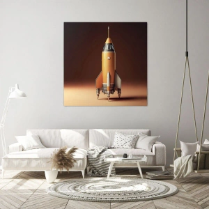 - Dette maleri forestiller en raket i retrostil mod en brun baggrund. Et inspirerende dekorationsstykke, der kombinerer elegance med fantasi og symbolikken fra rumrejser.