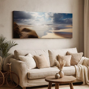 - Maleriet forestiller en vild strand med klitter og en blå himmel, omgivet af naturlig skønhed. Det er et ideelt valg for dem, der værdsætter fred og et harmonisk landskab.