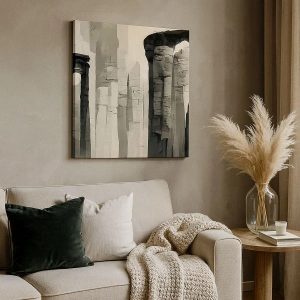 Maleriets komposition viser majestætiske søjler, der symboliserer styrke, stabilitet og tidløshed. Grå og sorte nuancer understreger stenens tekstur, hvilket giver maleriet dybde og raffinement. Subtilt lys og skygger skaber en harmonisk atmosfære, der bringer fred til ethvert interiør.