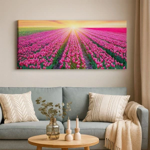 - Et charmerende maleri, der forestiller en tulipanmark badet i lyset fra den nedgående sol. Den perfekte blanding af lyserøde blomster, grønne blade og varme himmelfarver skaber et harmonisk landskab, der vil oplive ethvert interiør.