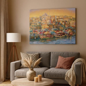 • Et levende panorama af Istanbul, der fremviser bugten og byen i al sin pragt. Et levende og livligt billede, perfekt til interiør inspireret af Orienten og historie.