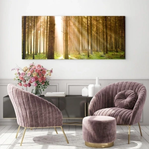 Solens stråler, der blidt oplyser den grønne skovbund, fremhæver naturens skønhed og dens detaljer. Skovmotivet symboliserer stilhed, friskhed og harmoni, hvilket gør det til et ideelt valg for dem, der søger inspiration og afslapning i deres eget hjem.
