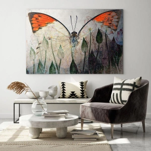 Maleriet med en sommerfugl og blomster er et forslag til dem, der værdsætter kunst inspireret af naturen og dekorationer med en subtil og romantisk karakter. Det er et fremragende valg for dem, der ønsker at introducere elementer af naturlig skønhed og harmoni i deres interiør.