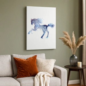 Lærredsmaleriet "Kunstnerisk hestekunstværk med træ- og fuglemotiv" er et unikt værk, der kombinerer naturens skønhed med kunstnerisk udtryk. Kompositionen skildrer den dynamiske silhuet af en hest, hvis konturer er harmonisk kombineret med fine trægrene og svævende fugle. Maleriet er dekoreret i subtile nuancer af blå og marineblå, hvilket giver det en usædvanlig elegant og beroligende karakter.
