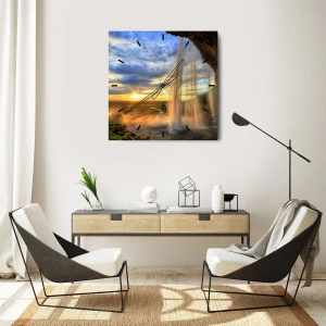 Vægur, Uret - Vandfald med udsigt til solnedgang - 30x30cm - Verden bag sløret af dråber - Moderne vægdekoration til stue, køkken og soveværelse ARTTOR