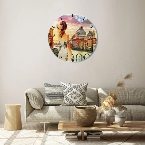 Væguret "Kun eventyr i..." er en unik dekoration, der introducerer en romantisk atmosfære og et kunstnerisk udtryk til interiøret. Urskiven forestiller en kvinde, der beundrer solnedgangen over det maleriske Venedig, hvor farvernes harmoni og detaljernes skønhed skaber en unik udsigt.