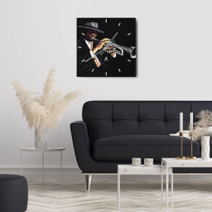 Vægur, Uret - En urskive med et jazztrompetistmotiv på en sort baggrund - 30x30cm - Gammeldags charme - Moderne vægdekoration til stue, køkken og soveværelse ARTTOR