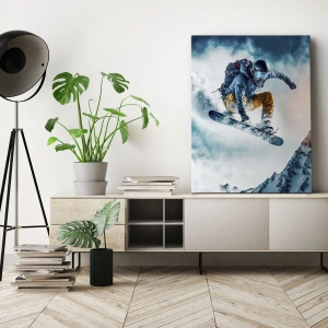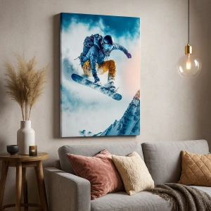 - Dette maleri forestiller en snowboarder, der svæver over snedækkede bjerge, fanget i et dynamisk øjeblik. Det er den perfekte dekoration for fans af ekstremsport og vinterlandskaber.