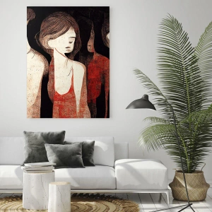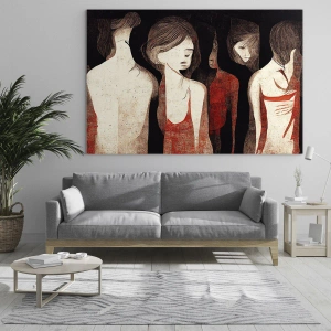 Kontraster dominerer maleriet – sarte konturer af kroppe står op mod intens rød og dyb sort. Figurerne præsenteres på en forenklet måde med en bevidst mangel på ansigtsdetaljer, hvilket giver dem anonymitet og universalitet. Rød symboliserer følelser, lidenskab og kropslighed, mens sort tilføjer mystik og refleksion. Kvinderne synes at være både til stede og flygtige – til stede i rummet, men samtidig internt lukket af. Arrangementet af figurer skaber en fortælling, der kan fortolkes som en dialog mellem forskellige aspekter af den kvindelige psyke eller som en følelsesmæssig cyklus. Hver figur har en forskellig kropsholdning og hovedhældning, hvilket indikerer individualiteten og flerdimensionaliteten i den afbildede scene.