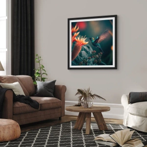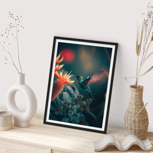 - Denne plakat forestiller en eksotisk kolibri, der svæver over orange blomster. Denne detaljerede komposition med harmoniske farver vil give dit interiør en unik, naturlig atmosfære.