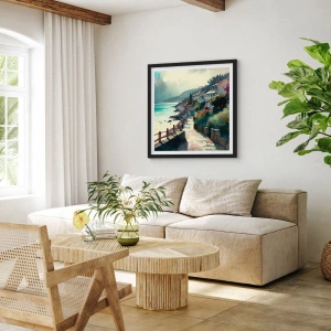 Plakat i sort ramme - En malerisk kyststi i akvarelstil - 50x70cm - Middelhavsby - Moderne vægdekoration til stue og soveværelse ARTTOR