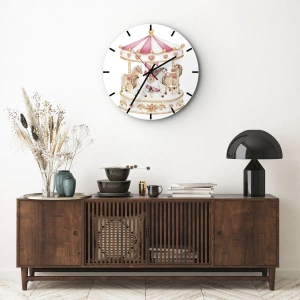 Vægur, Uret - Pink og cremefarvet karrusel med heste på en hvid baggrund - 30x30cm - Barndommens søde verden - Moderne vægdekoration til stue, køkken og soveværelse ARTTOR