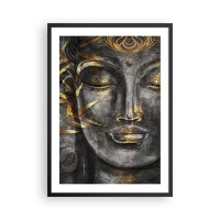 Plakat i sort ramme - Portræt af Buddha med gylden glød og bambusbladelementer - 50x70cm - Mærk freden - Moderne vægdekoration til stue og soveværelse ARTTOR