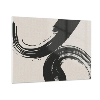 Billede på glas - Sorte, dynamiske kalligrafiske penselstrøg på en lys baggrund. - 70x50cm - Fejende og cirkulær - Moderne vægdekoration til stue og soveværelse ARTTOR