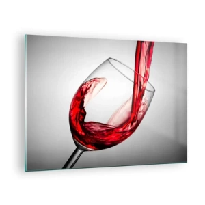 Billede på glas - Rødvin hældes i et glas mod en lys baggrund - 70x50cm - Farve - bevægelse - lyd - Moderne vægdekoration til stue og soveværelse ARTTOR