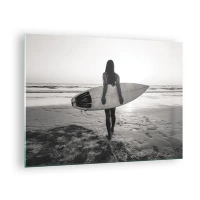 Billede på glas - Kvinde med et surfbræt på stranden ved solopgang - 70x50cm - Datter af havbølgen - Moderne vægdekoration til stue og soveværelse ARTTOR