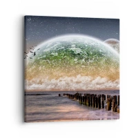 Lærredstryk - Billede på lærred - Et fantastisk landskab med en stor planet over havet og en træmole. - 70x50cm - Og verden kom op af vandet - Moderne vægdekoration til stue og soveværelse ARTTOR