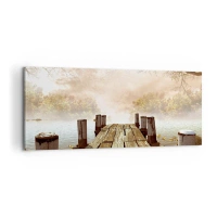 Lærredstryk - Billede på lærred - En træmole, der fører ud til en rolig sø i morgentågen - 70x50cm - Efterårets blide tristhed - Moderne vægdekoration til stue og soveværelse ARTTOR