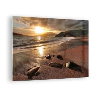 Billede på glas - Solnedgang over en klippefyldt strand og bakker - 70x50cm - Følg solen til bjergene - Moderne vægdekoration til stue og soveværelse ARTTOR