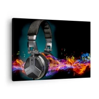 Lærredstryk - Billede på lærred - Sorte hovedtelefoner med en farverig musikvisualiseringseffekt - 70x50cm - I musikkens varme - Moderne vægdekoration til stue og soveværelse ARTTOR