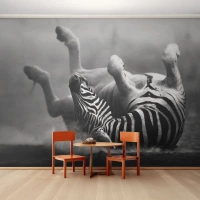 Fototapet Standard Eco - En sort og hvid zebra, der ruller i sandet på savannen - 100x70cm - Ikke kun en hest ville grine - Moderne vægdekoration til stue og soveværelse ARTTOR