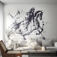 Fototapet Standard Eco - Sort-hvid illustration af en ridder til hest i dynamisk bevægelse - 100x70cm - Sort ridder - Moderne vægdekoration til stue og soveværelse ARTTOR