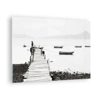 Billede på glas - Sort-hvid udsigt over en træmole over en sø - 70x50cm - Over stille og klart vand - Moderne vægdekoration til stue og soveværelse ARTTOR