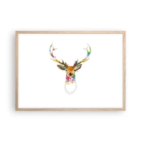 Plakat i ramme af lyst egetræ - Blid kronhjort badet i farver - 100x70 cm