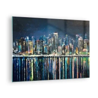 Billede på glas - Panorama over byen om natten med lysene reflekteret i vandet - 70x50cm - Kaskade af lys - Moderne vægdekoration til stue og soveværelse ARTTOR