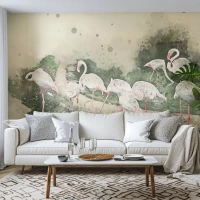 Fototapet Standard Eco - En gruppe flamingoer ved vandet i en kunstnerisk akvarelstil. - 100x70cm - En eksotisk drøm - Moderne vægdekoration til stue og soveværelse ARTTOR