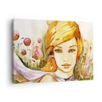 Lærredstryk - Billede på lærred - Portræt af en kvinde i akvarelfarver med et intenst blik - 70x50cm - Smaragdblikket, der dulmer vreden - Moderne vægdekoration til stue og soveværelse ARTTOR