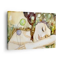 Billede på glas - En sovende kvinde i et kunstnerisk akvarelmaleri i varme farver. - 70x50cm - Smaragd-violet drøm - Moderne vægdekoration til stue og soveværelse ARTTOR