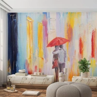 Fototapet Standard Eco - Et par under en rød paraply i et farverigt bymiljø - 100x70cm - Lad det regne mere - Moderne vægdekoration til stue og soveværelse ARTTOR