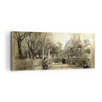 Lærredstryk - Billede på lærred - En tegneseriescene af en park med mennesker, der går i varme toner. - 70x50cm - Et øjeblik med fjer - Moderne vægdekoration til stue og soveværelse ARTTOR