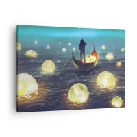 Lærredstryk - Billede på lærred - En figur i en båd omgivet af lysende kugler på vandet - 70x50cm - Ting, som filosoffer aldrig har drømt om - Moderne vægdekoration til stue og soveværelse ARTTOR