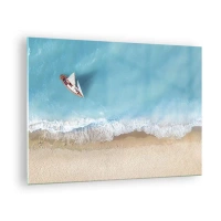 Billede på glas - En sejlbåd på det azurblå hav ved en sandstrand - 70x50cm - På grænsen mellem blå og guld - Moderne vægdekoration til stue og soveværelse ARTTOR