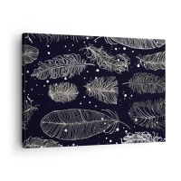 Lærredstryk - Billede på lærred - Fine hvide fjer på en marineblå baggrund - 70x50cm - Fjerede blonder - Moderne vægdekoration til stue og soveværelse ARTTOR