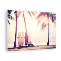 Lærredstryk - Billede på lærred - Palmer og surfbrætter på stranden i solskinnet - 70x50cm - Det bliver en fantastisk dag - Moderne vægdekoration til stue og soveværelse ARTTOR