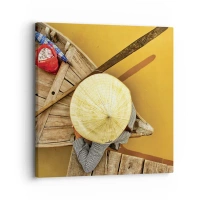 Billede på glas - Set ovenfra af en båd og en person med en konisk hat - 70x50cm - Livet på den gule flod - Moderne vægdekoration til stue og soveværelse ARTTOR