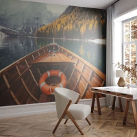 Fototapet Standard Eco - Udsigt fra en træbåd over en sø omgivet af bjerge og skov - 100x70cm - Bjergtur - Moderne vægdekoration til stue og soveværelse ARTTOR