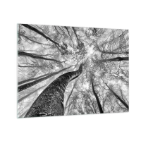 Billede på glas - Sort-hvide træer fotograferet nedefra mod himlen - 70x50cm - Kapløb mod lyset - Moderne vægdekoration til stue og soveværelse ARTTOR