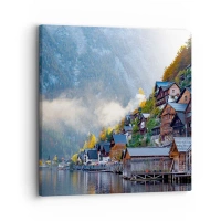 Billede på glas - En efterårsmorgen i en bjergby ved en sø - 70x50cm - Alpine climes - Moderne vægdekoration til stue og soveværelse ARTTOR
